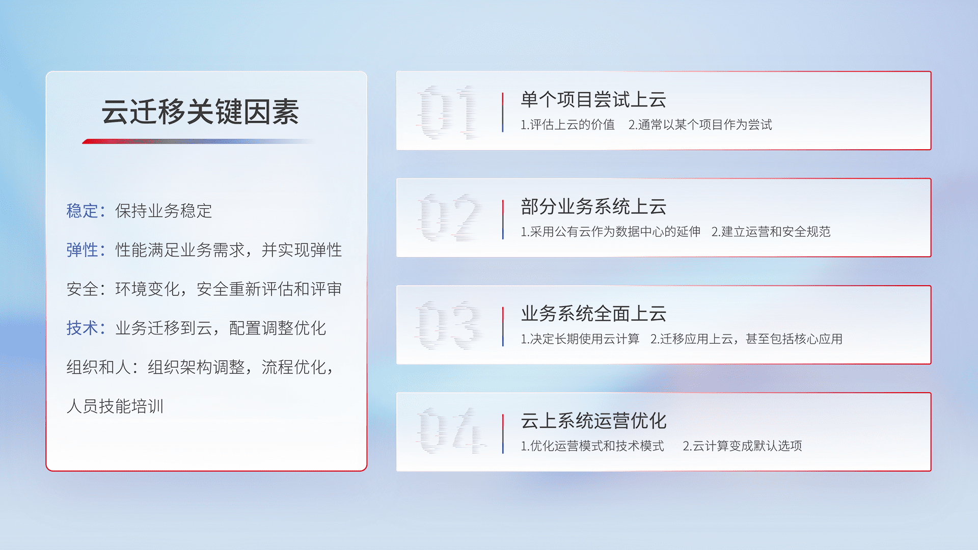 结合实际业务,,,从规划设计、、、、云平台选型、、、、云原生改造、、数据迁移、、集成交付,,迁移全过程为客户识别最佳上云路径,,做好风险识别管理,,设计网络架构、、、身份权限、、、安全审计合规、、操作审计、、、日志审计、、、、监控告警策略、、、、多站点容灾设计等,,对云上基础设施进行整体规划,,,,提升IT治理水平,,,以满足弹性、、、、高可用、、高性能的需求。。。。