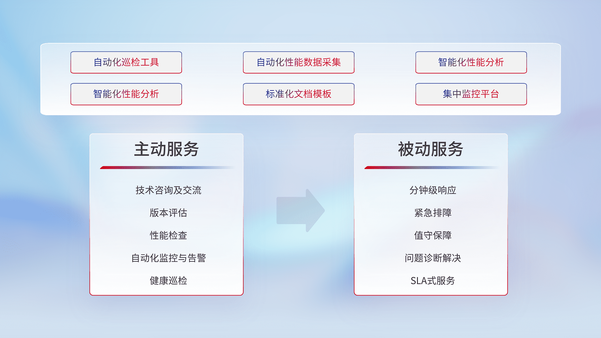 智能化工具和标准化文档,,,,保障服务质量,,,提供主动服务(包含技术咨询、、、版本评估、、性能检查、、、、自动化监控与告警、、、健康巡检)和被动服务包含(分钟级响应、、紧急排障、、值守保障、、、问题诊断解决、、SLA服务)。。。。